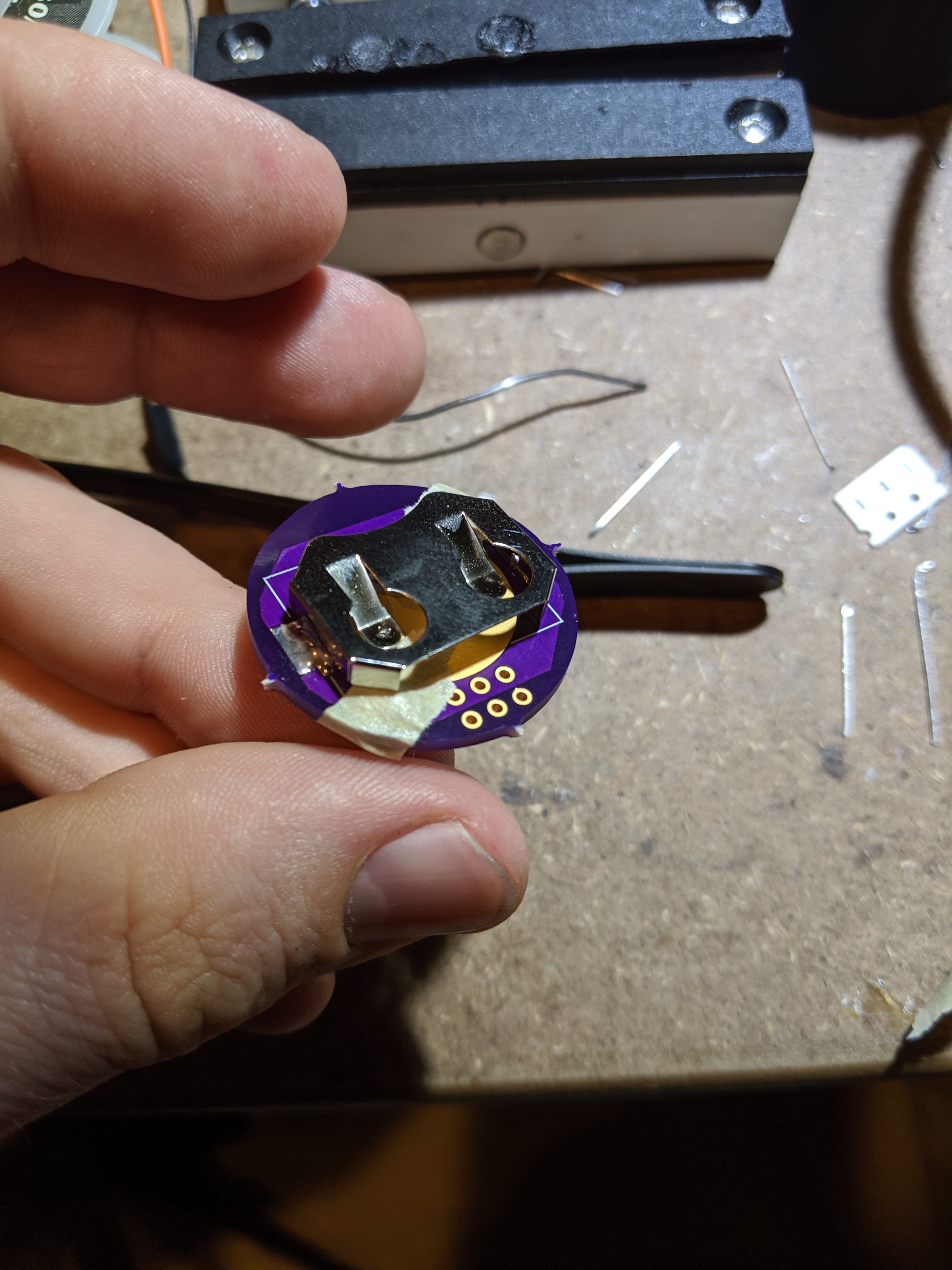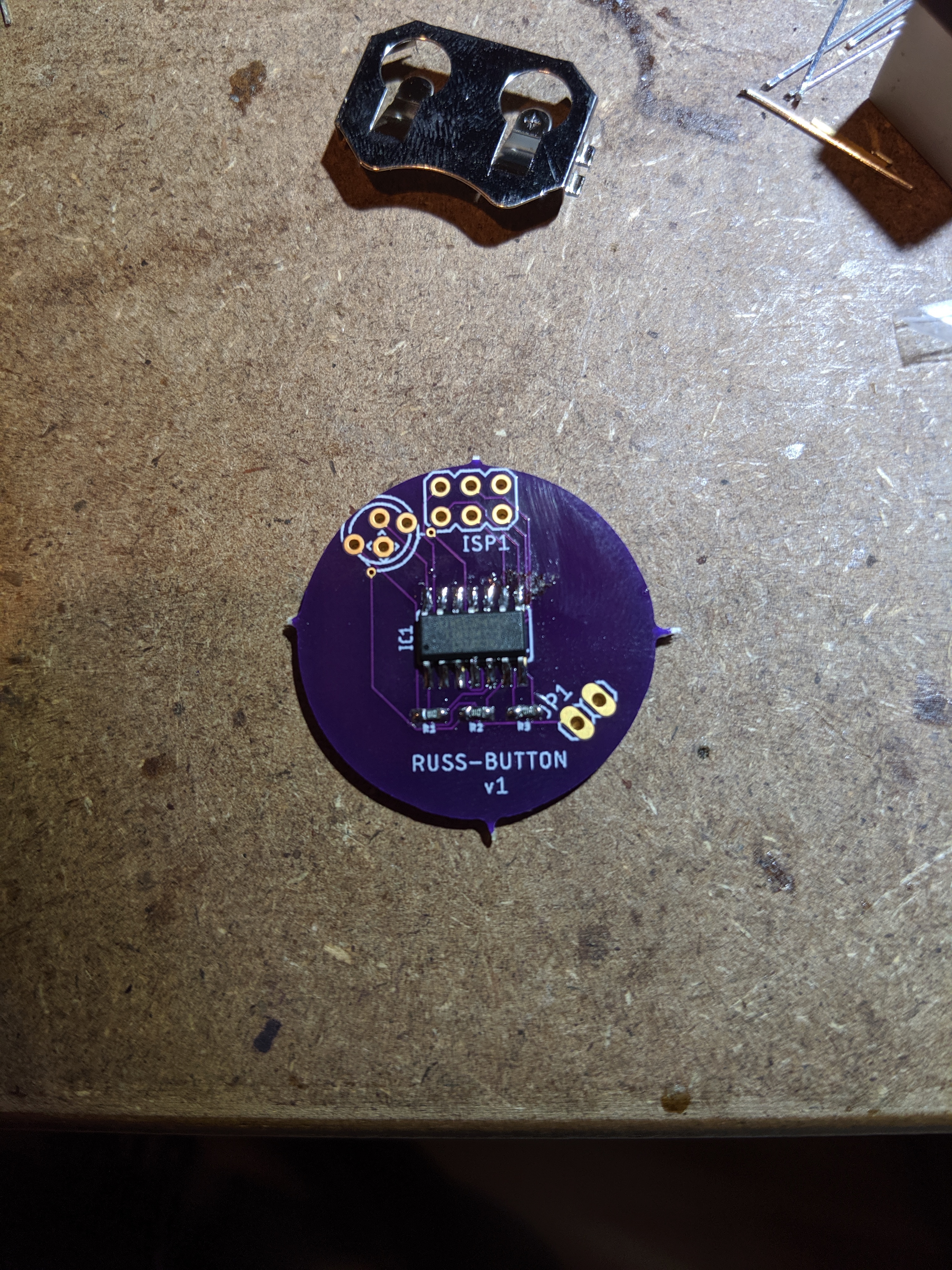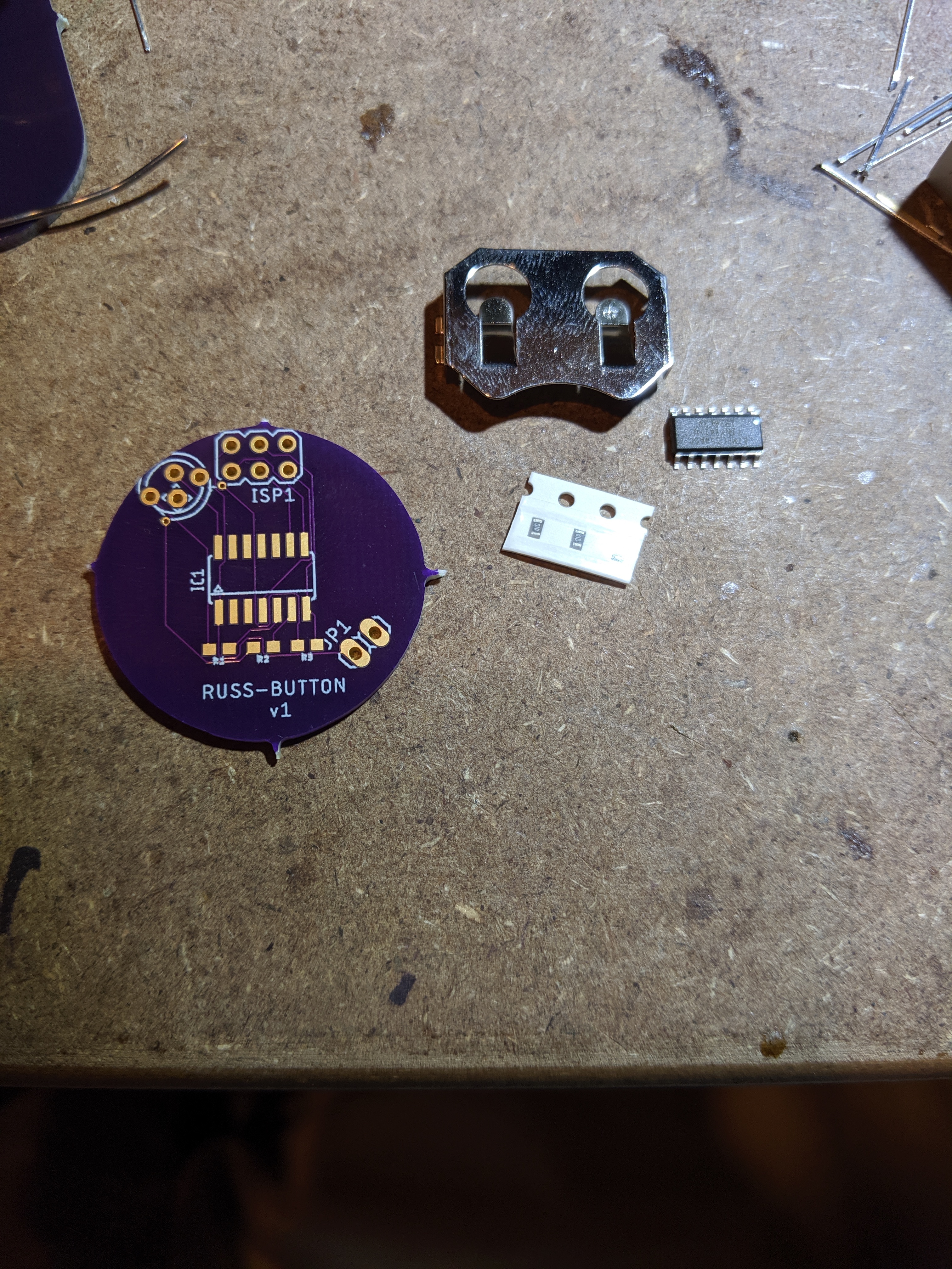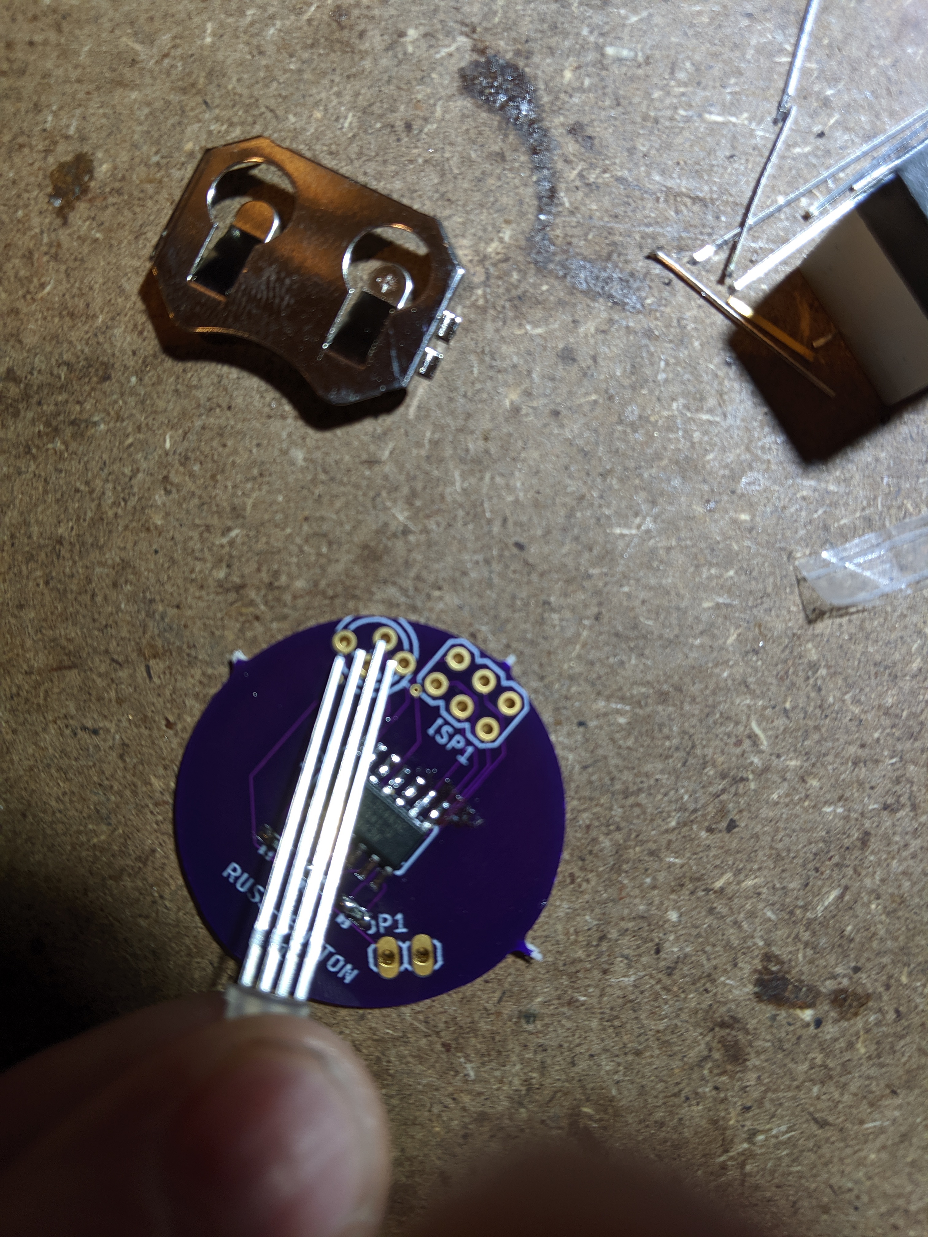 I first solder on the tiny resistors. I tin the pads, then put them on one at a time. Next is the ATTINY. Then the RGB LED (look at the polarity). I then tin the pad for the battery for tension, and finally the two jumpers. I goofed on my prototype, and made the battery polarity reversed. oops. The Osh model is fixed.