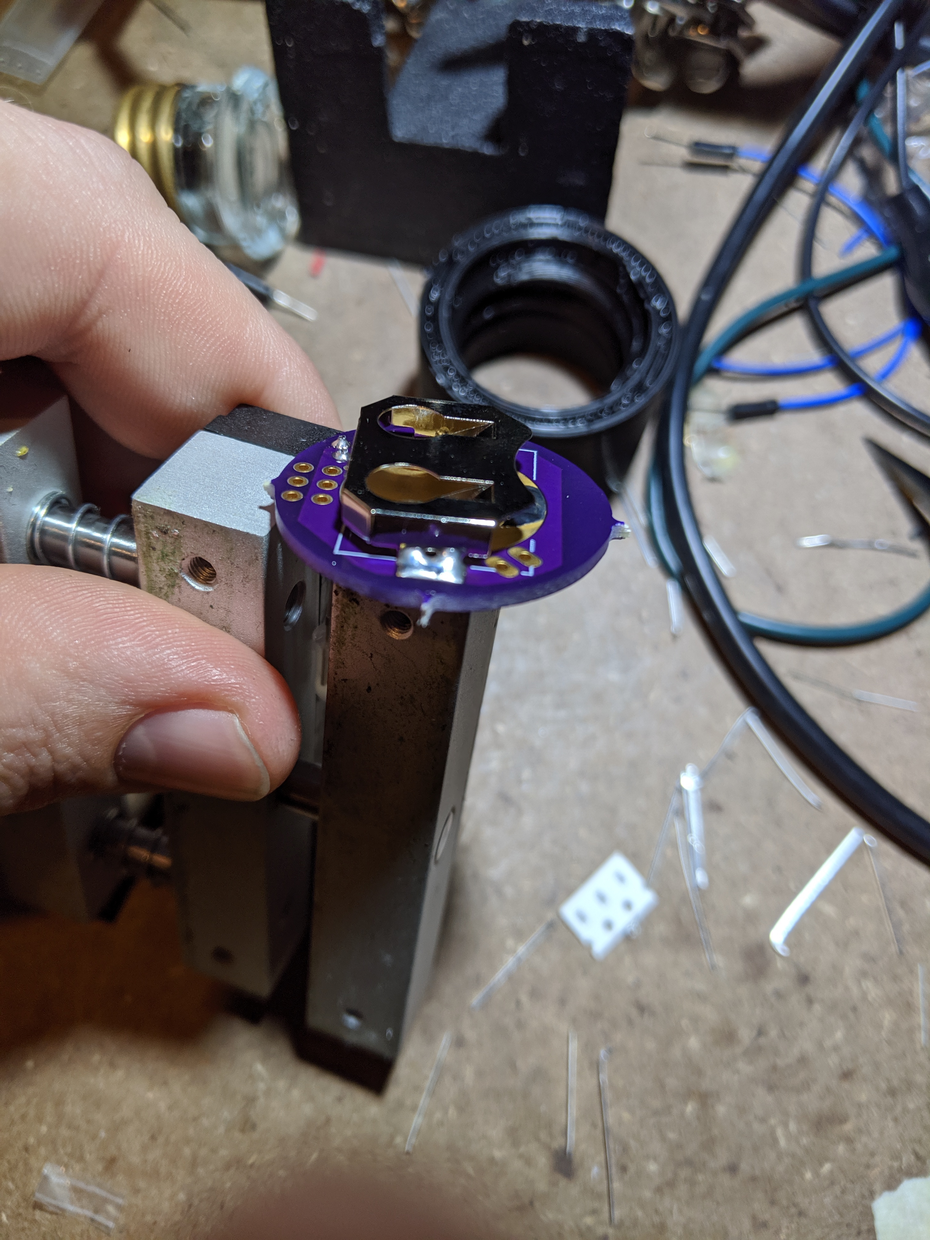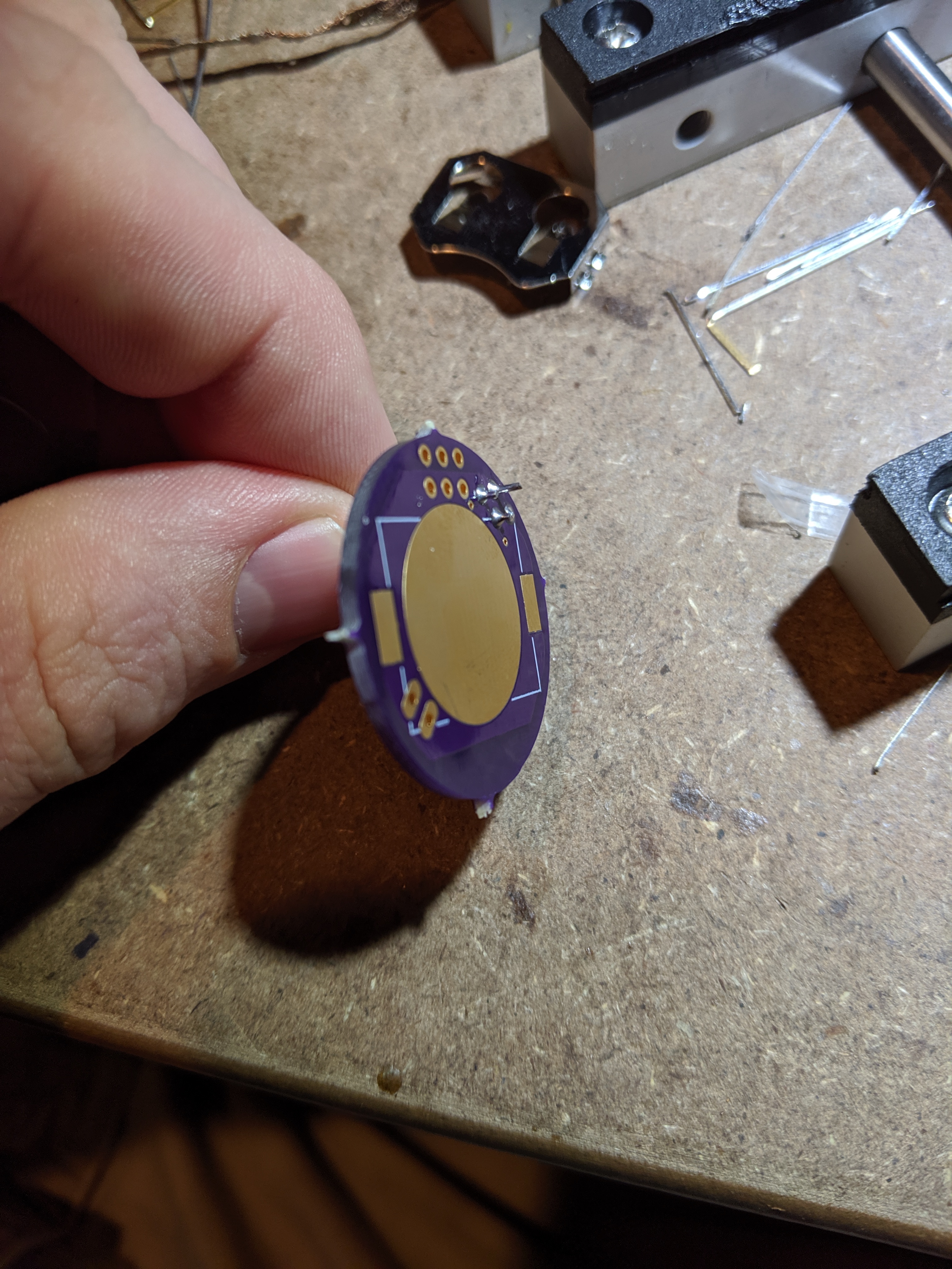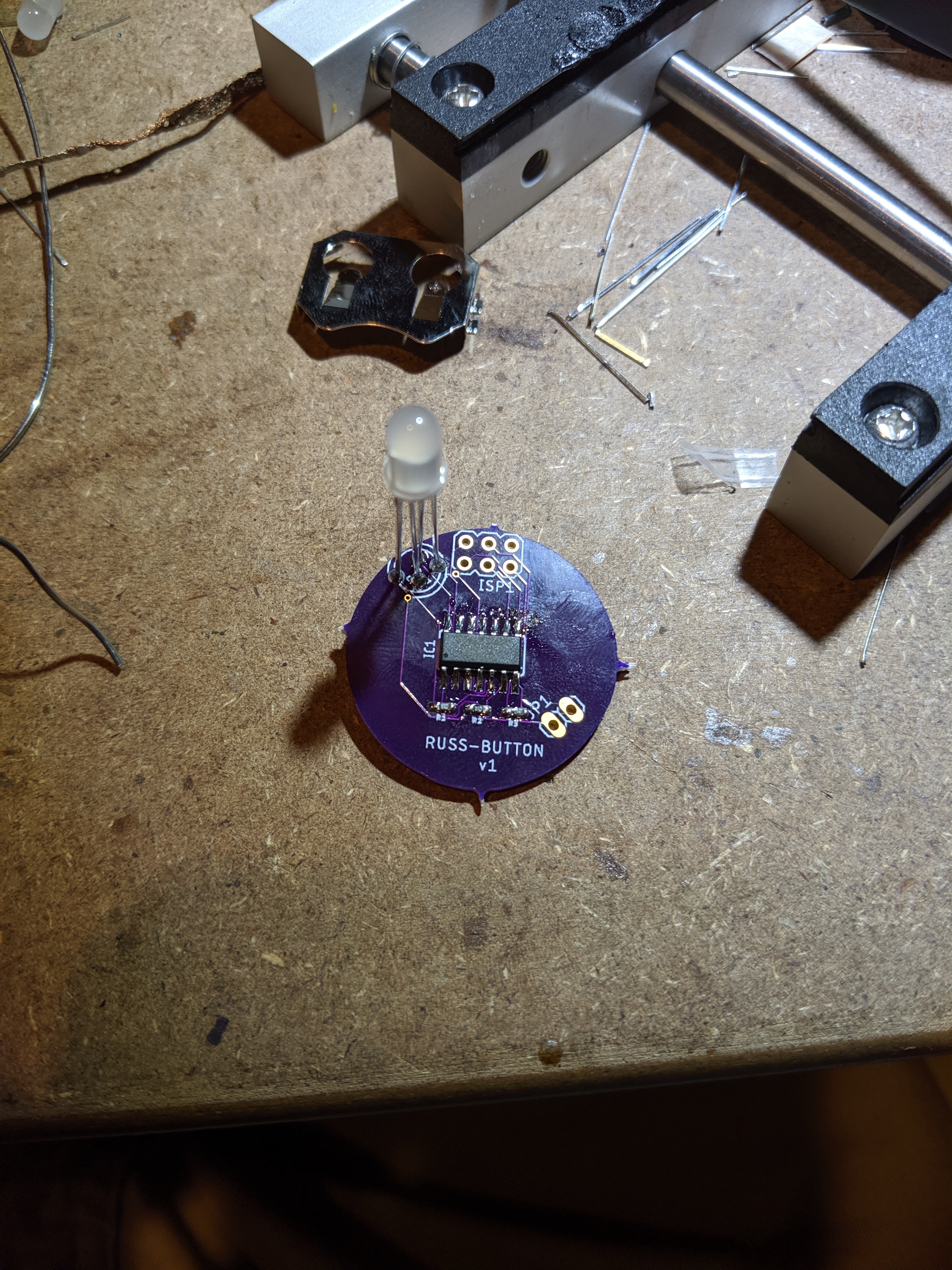 I first solder on the tiny resistors. I tin the pads, then put them on one at a time. Next is the ATTINY. Then the RGB LED (look at the polarity). I then tin the pad for the battery for tension, and finally the two jumpers. I goofed on my prototype, and made the battery polarity reversed. oops. The Osh model is fixed.