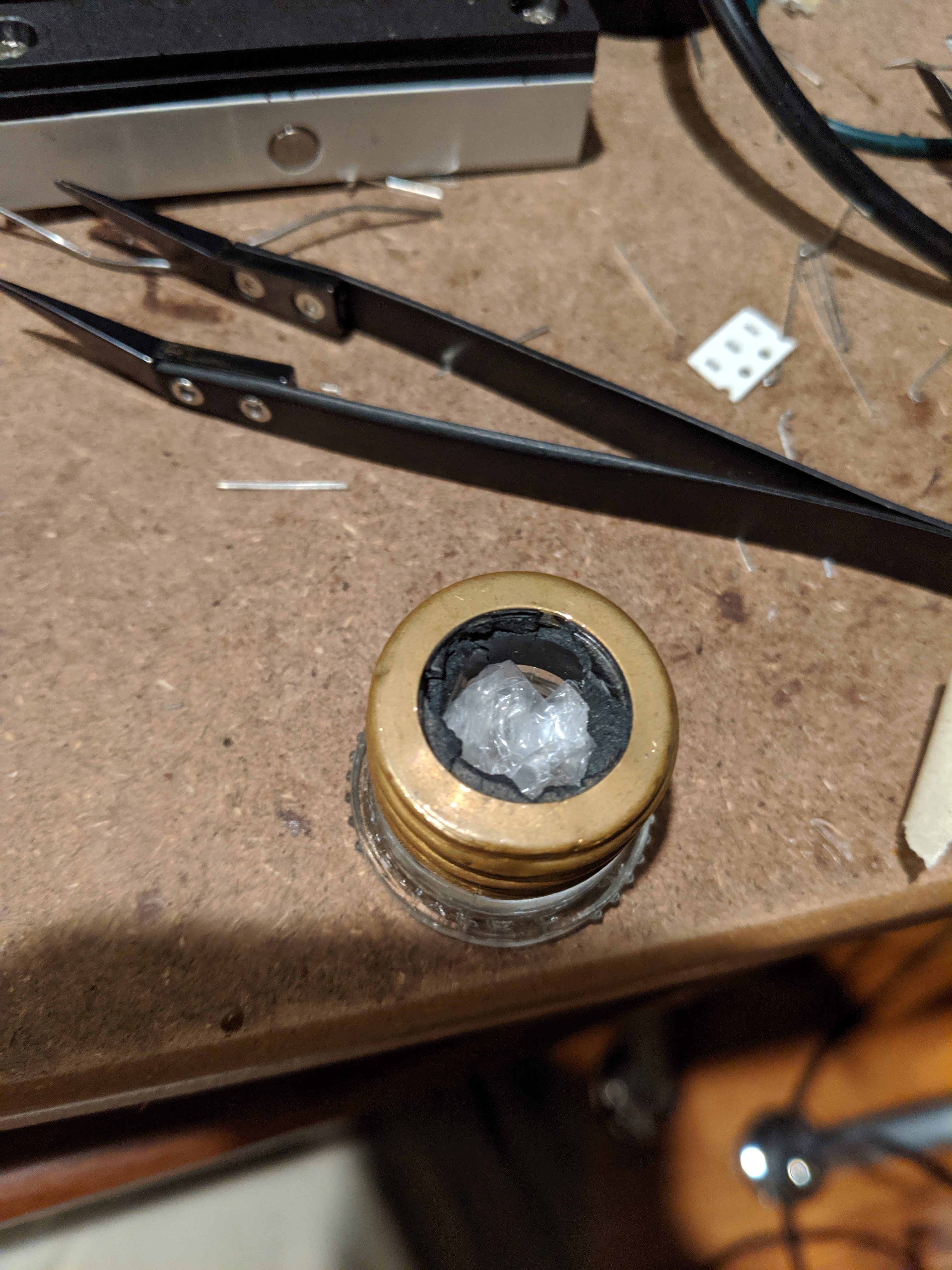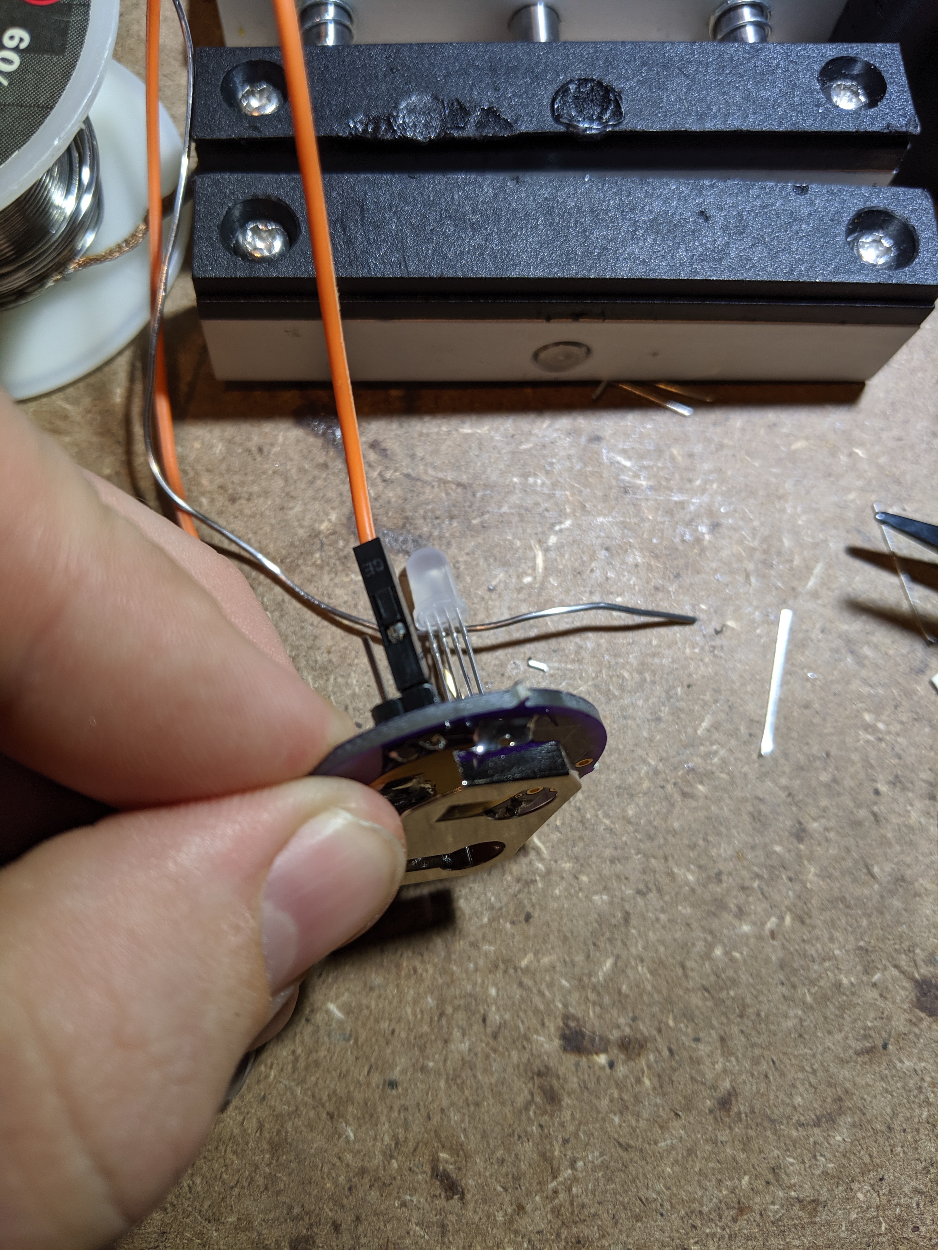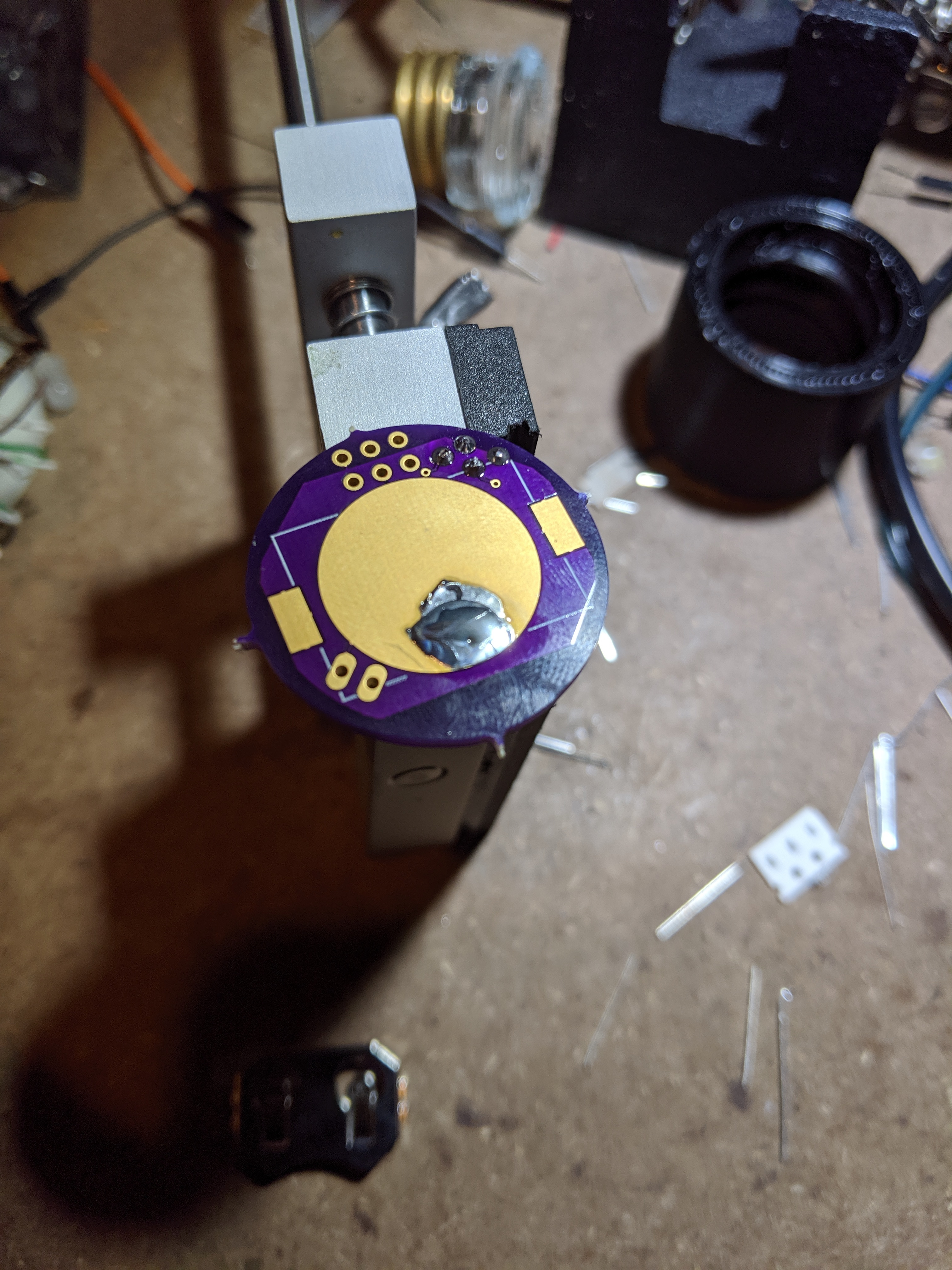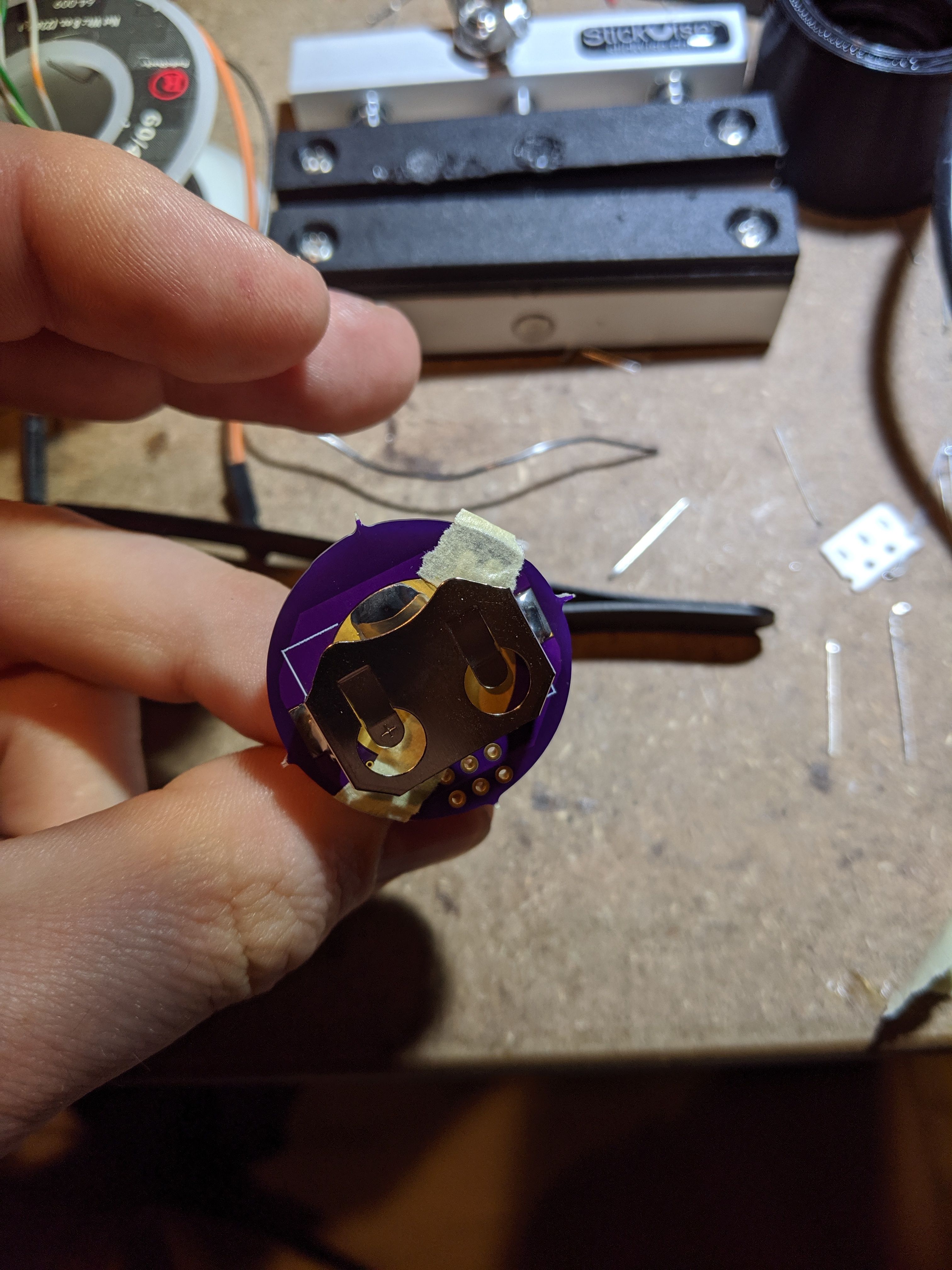 I first solder on the tiny resistors. I tin the pads, then put them on one at a time. Next is the ATTINY. Then the RGB LED (look at the polarity). I then tin the pad for the battery for tension, and finally the two jumpers. I goofed on my prototype, and made the battery polarity reversed. oops. The Osh model is fixed.